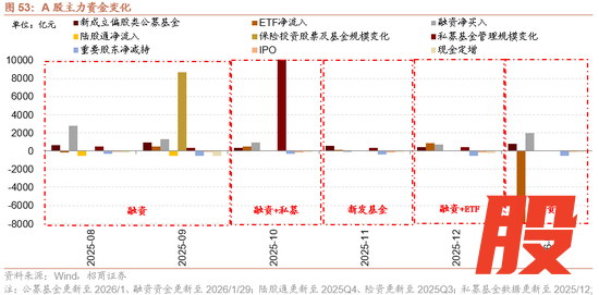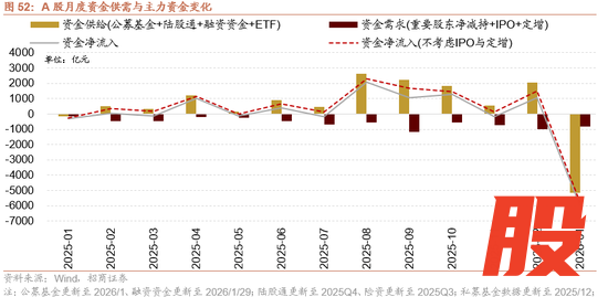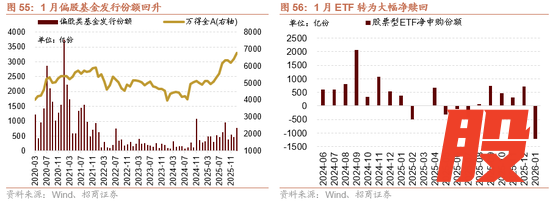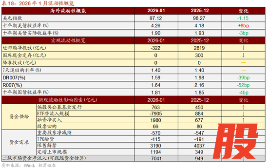 2月增量资金或继续净流入,节前外资有望继续净流入,节后融资有望回流。宏观流动性方面,政府债券在1月集中发行缴款,对流动性形成一定抽水效应。央行采取了精准有力的对冲措施,通过中期流动性工具弥补资金缺口,2月资金面有望继续保持平稳充裕。外部流动性方面,从特朗普新提名的美联储主席沃什的政策主张来看,沃什更可能采取温和且渐进的降息策略,其更倾向于将降息与缩减资产负债表(缩表)配合,以对冲宽松效应,避免通胀反弹。目前市场对2026年的降息预期从原先的1次上调至2次。股票市场资金供需方面,1月股票市场可跟踪资金转为净流出,融资成为主力增量资金,ETF大幅净赎回。资金供给端,新发偏股基金规模有所回升,以沪深300为代表的规模指数ETF大幅净流出,融资资金风险偏好回升净流入。资金需求端,重要股东净减持规模扩大;IPO发行规模及再融资规模有所回落,资金需求规模保持平稳。展望2月增量资金有望继续净流入,节前外资有望继续净流入,节后融资有望回流。