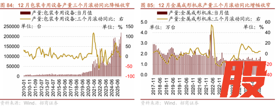12月包装专用设备产量同比增幅扩大,三个月滚动同比降幅收窄。12月包装专用设备产量220174台,当月同比增幅扩大3.40个百分点至11.40%,三个月滚动同比降幅收窄4.17个百分点至-0.03%;1-11月累计产量197.58万台,累计同比增幅收窄0.90个百分点至18.20%。
