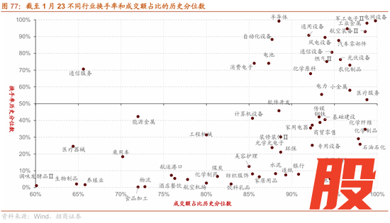 交易集中度:近期市场成交情况分化明显,从不同行业换手率历史分位数和成交额占比来看,电网设备、军工电子、航空装备、工业金属、汽车零部件、发电设备、通用设备、半导体等等领域交易占比相对较低。