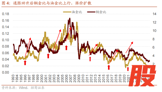 当投资者在通胀升温预期改善,将会黄金换成实物或者股权资产,油金比、铜金比将会回升。所以,历史上铜金比、油金回升也基本是在2021、2016、2011、2006、2011年前后。简单的说就是,黄金作为一种准货币,可以在全球货币扩张阶段用于抵消纸币的贬值,而真正通胀升温开始,黄金是不如铜和油的。
