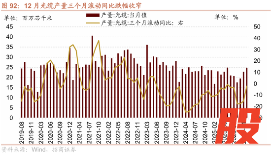 12月光缆产量三个月滚动同比跌幅收窄。1-12月光缆产量累计值为251.18百万芯千米,同比跌幅收窄1.40个百分点至-5.30%,三个月滚动同比跌幅收窄13.21个百分点至-2.10%。