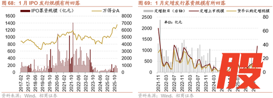 以发行日期为参考,2026年1月有12家公司IPO,合计募资规模115亿元,较12月前值191亿元继续回落。按上市日期统计,1月定增发行募资规模66亿元,较12月前值267亿元有所回落。展望2026年2月,IPO发行规模或有望稳中有升。
