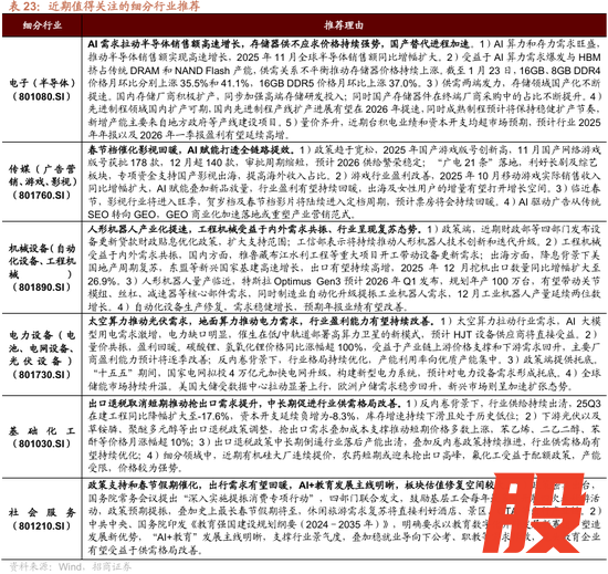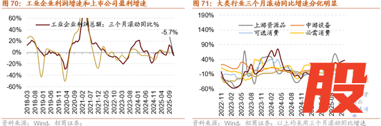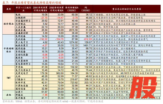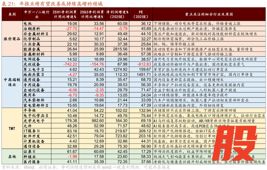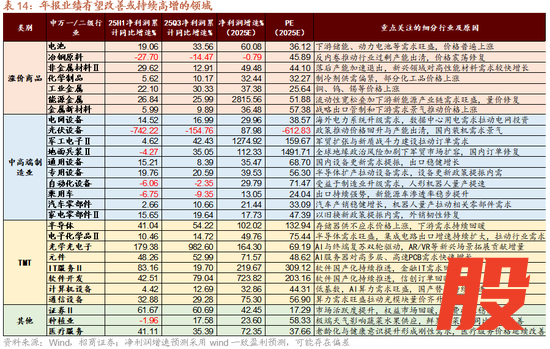 2)中高端制造业:新能源及中高端制造业受益于政策支持和需求回暖双轮驱动,其中AI模型迭代拉动电力需求,海外电网升级需求旺盛,新能源车渗透率稳步提升,新能源产业链量价齐升,电网设备有望延续高增,光伏设备、电池盈利有望改善;军工订单延续回暖,叠加地缘政治风险加剧背景下军贸加速突破,军工电子、地面兵装等行业盈利修复确定性较强;制造业升级和“两新”政策提振需求,机械设备出口稳健增长,汽车出口同比增幅持续扩大,产业端人形机器人量产提速,通用设备、专用设备、自动化设备、乘用车、汽车零部件、家电零部件行业盈利有望改善。