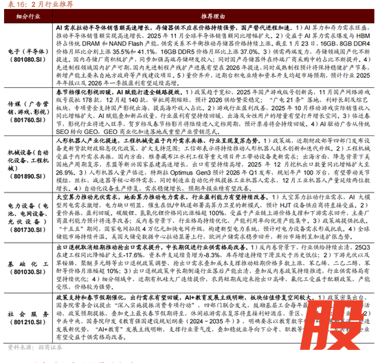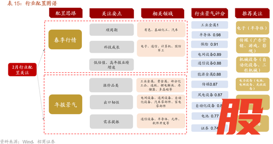 综合盈利、行业景气和交易等维度,2月推荐重点围绕顺周期+科技领域布局,同时随着春节临近和政策的持续助力,增加对部分可选消费的关注。典型行业如电子(半导体)、传媒(广告营销、游戏、影视)、机械设备(自动化设备、工程机械)、电力设备(电池、电网设备、光伏设备)、基础化工、社会服务等。