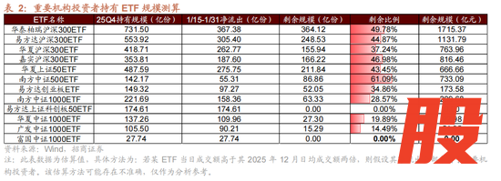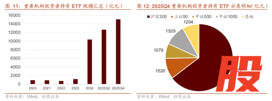 截至2025年四季度,重要机构投资者持仓约为1.5万亿。从细分持仓来看,沪深300ETF占比最高、规模接近万亿;上证50、中证500与中证1000 ETF规模均在1000亿以上。