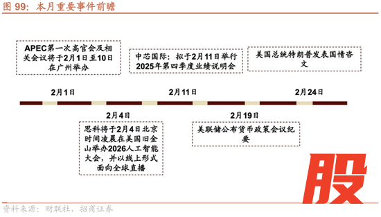 结合近期基本面、政策面、流动性等多方面因素,我们认为2月在前期监管释放降温信号和ETF大幅流出后,市场在未来一段时间将会以震荡为主。在业绩预告披露结束后,市场阶段性会围绕商业航天、AI算力及应用等主题进行交易,同时由于涨价的扩散,市场也会继续在以石油石化、建材、钢铁、化工、白酒等涨价领域进行阶段性交易。但是在缺少净增量的环境下,轮动可能会加速,交易难度进一步提升。整体风格也有望相对均衡,风格轮动也可能会加快。