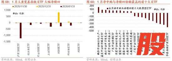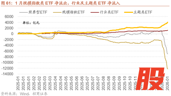 近期宽基指数ETF成交量显著放大,且大幅净流出。从1月14日开始,宽基ETF成交量逐渐放大,至1月16日宽基ETF成交量创下历史新高,超过2025年4月8日重要机构投资者救市时的成交额,随后多个交易日连续创下历史新高。同时宽基ETF大幅净流入,1月后半个月累计净流出9802亿元。