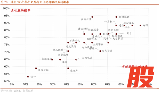 日历效应:由于每年例如业绩预告、两会、政治局会议、业绩考核等等具有季节性效应,每个月的行业有一定的季节性,也可以作为行业选择的参考。每年2,相对较高概率出现超额收益的行业主要集中在机械设备、通信、电子、医药生物、计算机等偏成长领域和美容护理、纺织服饰、农林牧渔等消费领域。