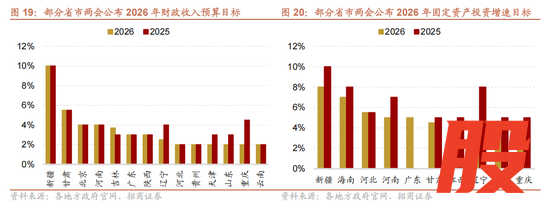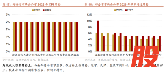 从政策层面看,截至1月31号,20个省市召开地方两会并公布2026年各项经济目标。设置区间经济增速目标的城市大幅增加,包括浙江、广东、江西、新疆,全年经济增速可能设为区间增速目标。各省市CPI目标与去年基本持平,财政收入预算目标与去年持平省市居多,社零预算目标及固定资产投资增速目标较去年下调的省市偏多。