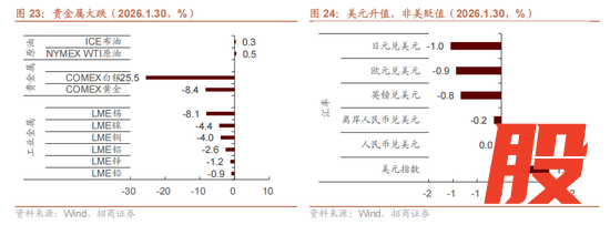但现实的情况是,特朗普最终选择了沃什,其政策主张显然没有那么鸽派,且强调“厘清货币政策与财政政策的职能边界”,缓解了市场对美联储独立性的担忧,并且中长期来有利于提振美元,所以前期的叙事逻辑短期面临修正。因此从沃什被特朗普提名为美联储新主席的概率飙升开始,全球资本市场就出现巨震,美元指数走高,股票和商品大跌,尤其贵金属暴跌,其中comex黄金从高点最大回撤超过16%;comex白银从高点最大回撤超过39%,相对应的,股票市场的金属板块重挫。汇率方面,人民币汇率相对比较稳定,贬值幅度较小。