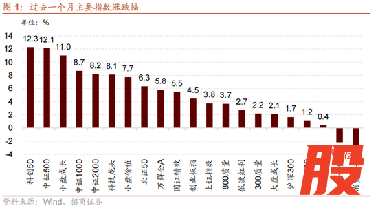 最终1月延续12月下旬的开年攻势,出现不同程度反弹。其中,上证指数小幅上涨3.8%,沪深300小幅上涨1.7%,WIND全A指数上涨5.8%。科创50、中证500、小盘成长涨幅较大。消费龙头、大盘价值逆势下跌。总体来看,市场发动了我们1月报中描述的“开年”,科技风格成为1月份相对占优的风格。