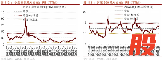 今年一月末小盘指数绝对估值水平为30.8X(处于2010年以来60.7%分位),相比去年十二月末上行2.9x。