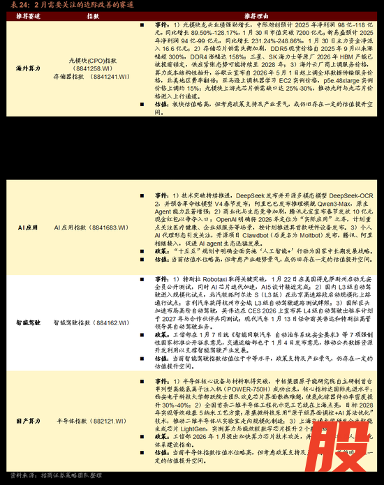 展望2月,赛道选择上我们依然坚持周期+科技的思路不变。具体来看,AI应用、智能驾驶、海外算力、国产算力四大领域产业催化密集落地,政策支持持续加码,主题投资机会明确。AI应用领域近期呈现出技术突破与商业化竞争同步深化的鲜明趋势。AI应用相关技术迎来核心突破,DeepSeek发布并开源多模态模型DeepSeek-OCR 2,并预告革命性模型V4春节发布,将直接推动文档理解与多模态应用技术的普及和下游开发;阿里巴巴也推出推理旗舰Qwen3-Max,其原生Agent能力显著增强。商业化层面,腾讯元宝宣布发放10亿元红包争夺用户入口,可能快速扩大其AI产品的用户规模与市场渗透率;OpenAI将2026年定为“实际应用”年并推进硬件,将加速AI在医疗、企业服务等垂直场景的落地。个人AI代理形态引发关注,开源项目Clawdbot(后更名为OpenClaw)发布,腾讯、阿里相继接入,展示AI向个人助手演进的重要趋势。叠加“人工智能 +”行动作为国家中长期发展战略,为行业提供坚实长期支撑。指数估值水位略高,但在产业趋势与政策红利的双重驱动下,上行空间值得期待。智能驾驶领域近期呈现技术加速落地与全球竞争格局深化态势,特斯拉Robotaxi取得关键突破,在美国得克萨斯州启动无安全员公开测试,推动高阶自动驾驶技术的实用化进程,为其后续算力与性能提升奠定硬件基础;国内L3级自动驾驶进入规模化试点,北汽极狐阿尔法S(L3版)于北京高速路段启动规模化上路通行试点,吉利汽车也获得杭州市全域L3级自动驾驶道路测试牌照,为技术迭代和商业模式的探索提供真实场景;国际巨头加速布局高阶自动驾驶,进一步加剧全球高阶自动驾驶赛道的竞争。政策层面,工信部就智能网联汽车多项强制性国家标准公开征求意见,旨在为产业的规范化与可持续发展构建基础支撑。当前智能驾驶指数估值位于中等水平,政策支持及产业景气,仍存在一定的估值提升空间。海外算力领域当前呈现高景气态势,核心环节的业绩、价格与资本开支均指向明确的产业趋势。光模块龙头公司业绩亮眼,中际旭创和新易盛发布的2025年净利润预增公告均显示数倍增长,其市值在1月底也创下新高并获大额资金流入,直接印证了由北美云巨头资本开支所驱动的AI算力基础设施需求处于爆发阶段。存储芯片市场出现严重供需失衡,DDR5等现货价格自去年9月以来已上涨超过300%,并且三星、SK海力士等原厂2026年的HBM产能已被提前预订一空,高端存储的紧缺格局持续。产业链的成本压力正在向上传导,谷歌云、亚马逊等海外云服务商纷纷宣布上调多项服务价格,而上游的光芯片也出现约25%-30%的供应缺口,算力使用成本结构性上升。当板块估值略高,但考虑政策支持及产业景气,或仍旧存在一定的估值提升空间。国产算力领域在核心设备、新兴技术路径与底层芯片架构上均取得关键突破,自主可控进程加速,在半导体设备方面,中核集团自主研制的首台串列型高能氢离子注入机成功出束,核心指标达国际先进水平,在关键设备上促进国产化替代;西安电子科技大学团队攻克芯片界面散热难题,提升下一代半导体材料氮化镓的性能上限。新兴技术产业化方面,全国首条二维半导体工程化示范工艺线在上海点亮,提供全新技术路径。在底层芯片架构创新上,上海交通大学成功研发了全光智能生成芯片LightGen,实测算力与能效得到数量级提升。政策上,工信部同期提出加快算力芯片技术攻关,为产业发展提供了明确的方向指引。估值层面,尽管当前半导体指数估值水位略高,但在持续的政策支持与产业突破下,行业仍被看好具备长期的成长空间。