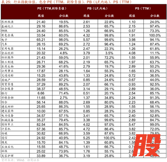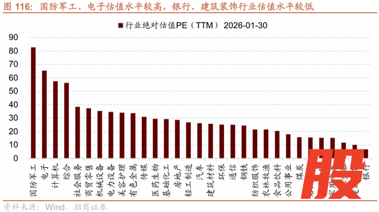 分行业来看,国防军工、电子、计算机、社会服务、商贸零售的估值水平高于其他行业,银行、建筑装饰、非银、家用电器、交通运输估值水平较低,其中银行的估值水平处于末位。