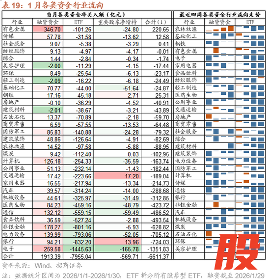 而表现较差的行业主要是一些受ETF流出影响较大的板块,依靠内需的板块,包括银行、非银金融、食品饮料等。
