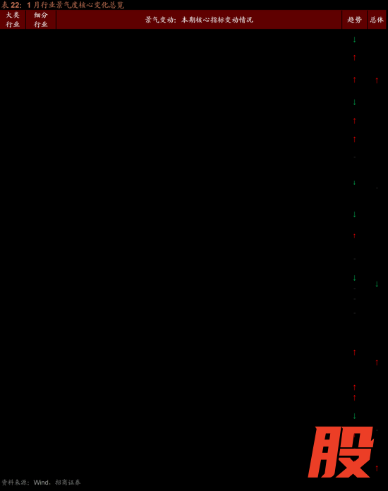 1月份景气较高的领域主要集中在部分资源品、公用事业和信息技术领域,其中资源品板块多数工业金属、化工品价格上涨,中游制造领域光伏价格指数上行,汽车产销放缓,消费服务板块生猪养殖盈利改善,四大家电零售额同比降幅收窄,金融地产中商品房销售持续低迷,公用事业领域燃气价格上涨。