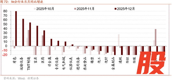 细分行业来看,1-12月在41个工业大类行业中,有16个行业利润同比增速较11月份改善;装备制造业仍然是增长的主要支撑,TMT制造贡献重要增量。装备制造业2025年利润同比增长7.7%,拉动全部规上工业利润增长2.8个百分点,出口改善,内需稳健,运输设备、专用设备当月同比增幅扩大至62.37%和12.23%,电气机械同比转正以旧换新政策效果仍在,资源品行业量价共振,有色、非金属当月同比分别转正至139.59%和16.40%,化工、化纤等行业当月同比降幅收窄;TMT行业盈利累计同比增幅扩大至19.5%,AI换新需求提振终端需求,智能消费设备行业利润同比增48.0%,储器供不应求,价格走强,集成电路制造,半导体器件专用设备同比增幅超100%。