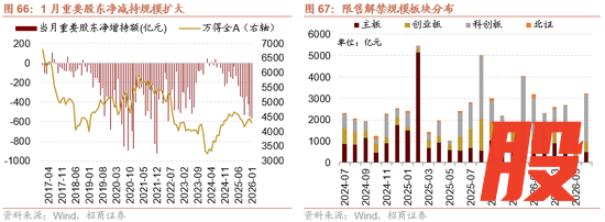 1月重要股东增持69亿元,减持638亿元,净减持570亿元,净减持规模较2025年12月前值547亿元有所回升。按照截至2026年1月31日收盘价估算,2026年2月解禁规模为2309亿元,解禁规模较2026年1月前值3190亿元有所缩小,不同板块解禁规模来看,主板1505亿元、创业板418亿元、科创板363亿元、北证22亿元。考虑到2026年2月解禁规模有所回落,2026年2月重要股东二级市场净减持规模有望保持平稳。