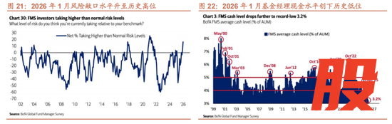 基于这些短期和中长期的逻辑,全球资本市场已经计入了太多的弱美元和流动性宽松预期,从而增加了市场的脆弱性。一个直观的表现就是全球各类资产表现正相关性提升,风险资产、避险资产齐涨齐跌,全球风险敞口极高,而现金持有水平降至历史低位。根据美银美林在1月20日发布的全球基金经理月度调研结果,受调研的基金经理风险敞口水平净高出正常水平16%,仅次于2021年高点;且现金持有水平进一步下降至3.2%,为2000年以来的历史最低水平,这些指标都表明在经济好转+通胀担忧缓解+美元走弱的预期组合下,市场整体情绪达到了历史性的极度乐观水平。