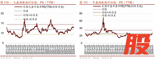 今年一月末中盘指数绝对估值水平为26.6X(处于2010年以来64.7%分位),相比去年十二月末上行2.3x。