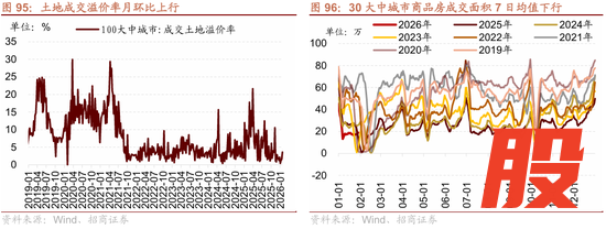 1月土地成交溢价率月环比上行,30大中城市商品房成交面积月环比下行。截至1月25日,100大中城市土地成交溢价率当周值月环比上行1.46个百分点,截至1月29日,30大中城市商品房成交面积7日均值月环比下行57.1%。1-12月份房屋新开工面积累计同比降幅收窄,房屋竣工面积累计同比降幅扩大,商品房销售额、商品房销售面积累计同比降幅扩大;房地产开发投资完成额、房地产开发资金来源累计同比降幅扩大。